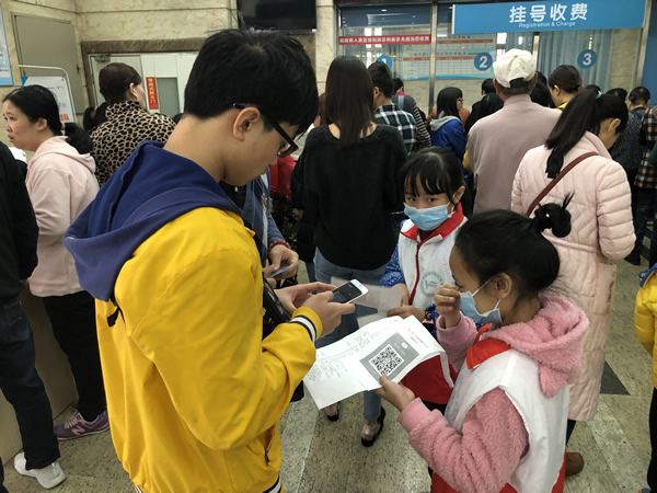 经过前期培训,他们正式上岗了,门诊挂号的长队里,到处有他们忙碌的身影。“爷爷,有什么可以帮到你的吗?”“哥哥,扫码可以微信挂号,就不用排队,要试一下吗,很方便的”……他们服务热情,充满活力,战斗力极强,光帮助推广微信挂号缴费就把长长的队伍“消灭”了一半。患者们被他们萌地心里暖暖的,也变得没有原来那么焦躁了。
