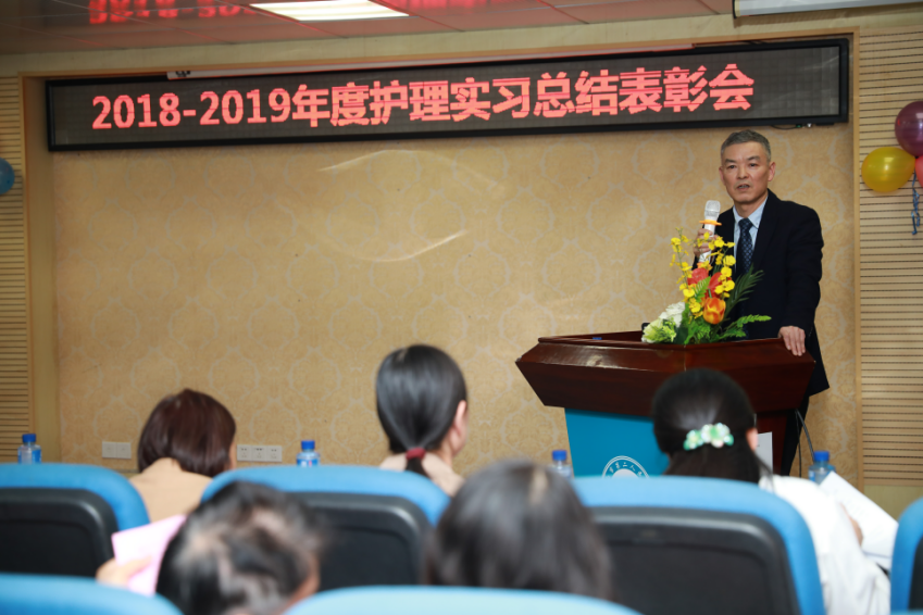 在大会上,护理部教研室温春良副主任对2018-2019年度护理教学工作作总结汇报:本年度我院共接收了来自佛山科学技术学院、广东药科大学、中山大学新华学院、嘉应医学院等9所院校共94名实习护生,通过合理安排实习轮转、实行本科护生“导师制”、建立规范的教学质量评价体系,开展多种形式的教学活动,不断提高临床带教老师教学水平和教学质量,真正做到教学相长。在师生们的共同努力下,圆满地完成了本年度实习计划及带教任务。为激励先进,护理部通过带教质量评价、实习护生及带教老师双向评价等方式,评选出重症监护病房和甲状腺胸外科两个优秀带教科室,妇产科许雪洁和消化内分泌科郭春花两位优秀教学秘书,吴丹丹、李玉玲、苏焕玲等10名优秀带教老师及14名优秀实习护生。感谢全院各科室和带教老师们的辛勤付出,希望全体实习护生坚定信念,不忘初心,继续在护理事业的道路上绽放光彩。