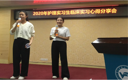 会议由2020年护理实习生班长陈洛华和宣传委员冯小娟主持。来自八间院校的护生代表逐一上台分享,他们用朴实的语言、生动的细节与同学们分享了四个多月临床实习的收获和感受。在这短短的几个月实习里,从初来乍到的懵懵懂懂到如今的不断进步,从来时的不知所措到如今的坚强自信,同学们感慨万千,除了感激医院的培养之恩,还感恩各位临床带教老师们的辛勤付出。一路走来,有护理部精心组织的各项教学活动安排,有临床科室护长及教育护士的重视及关心,还有临床带教老师用心的谆谆教导,在佛山市二这个大家庭中,不仅提升了专业理论知识和技能,还收获了很多爱和温暖。