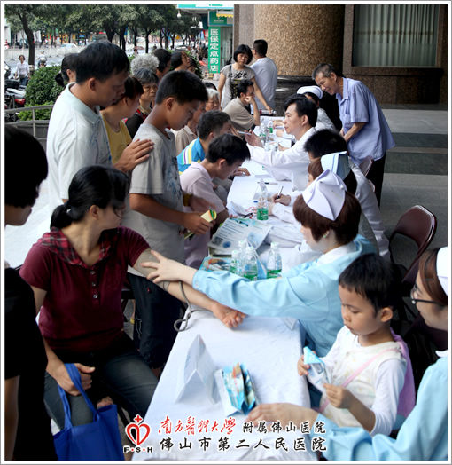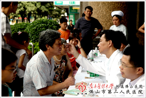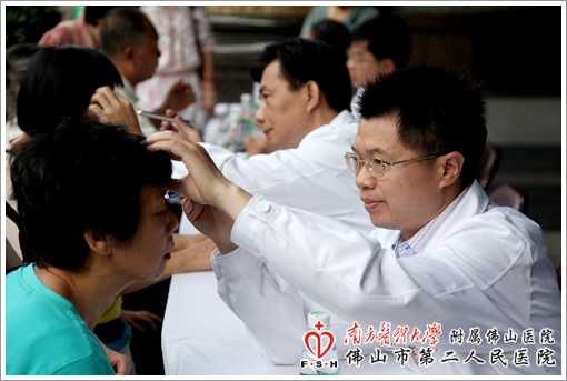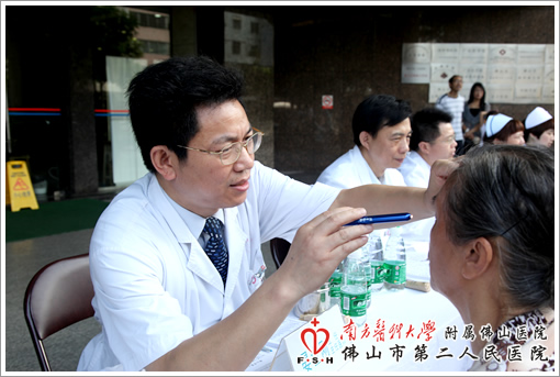 在广大群众热烈庆祝传统节日之时,作为佛山市防盲办公室所在地、佛山市低视力康复定点医院,为普及低视力防治康复知识,提高低视力患者生活质量和康复水平,保护人民群众眼健康,我院眼科中心晏世刚、卢浩泉主任等医护人员利用休息时间在2号楼大厅门口,开展义诊普查活动。
