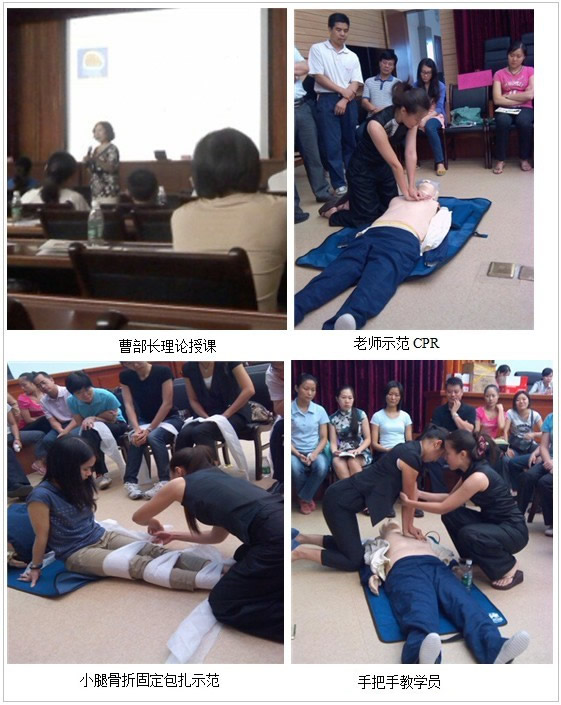 培训内容分为理论及实操。理论授课邀请了中国红十字会总会训练中心急救培训部副部长曹乃文部长讲授。她的授课让我为之震撼。她在授课时提到:为什么是发生火灾后才调查群众对于火灾逃生掌握没有;地震之后才调查市民发生地震了会怎样做;水灾了才调查市民发生水灾了会怎样做?为什么只是头痛医头,不是防患于未然,加大对突发安全事故的急救培训呢?据调查,中国的急救知识普及率还不到1.5%。