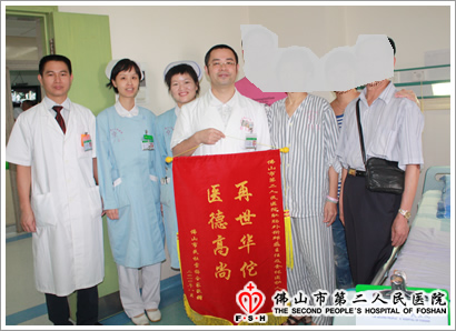 原来,女患者因持续便血半年,在我院行纤维结肠镜检查被医生诊断为直肠癌,随后入住肛肠外科治疗。入院后,患者的情绪一度十分低落,在医护人员耐 心的解释病情和鼓励下,重新燃起了新的希望,并积极配合医生的治疗。邱磊主任根据病情为其实施了腹腔镜直肠癌根治、回肠造瘘口术,两周后再行回肠造瘘口关闭术。术后患者在医护人员的精心治疗和护理下,病人身体恢复很快,并康复出院。在出院之际,病人家属怀着万分感谢的心情向邱主任和全科医护人员送上锦旗,并紧握邱主任的手说:“你是再世华佗,非常感谢,非常感谢!”。语言上充满了对肛肠科医护人员无限感激之情和对医院及肛肠外科由衷的谢意。