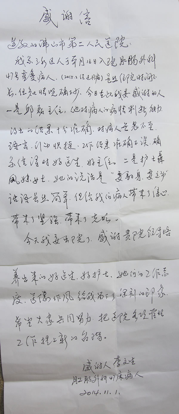 患者送普外三区邱磊主任感谢信