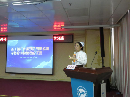李燕如副主任首先为学习班授课,以“基于循证依据预防围手术期深静脉血栓管理的证据”为题,以个案的形式深入浅出地分析深静脉血栓的原因、高危因素、预防措施等,并用循证护理的方法指导护理实践。她认为,护理工作有理有据,才能采取最有效的护理措施服务于病人。