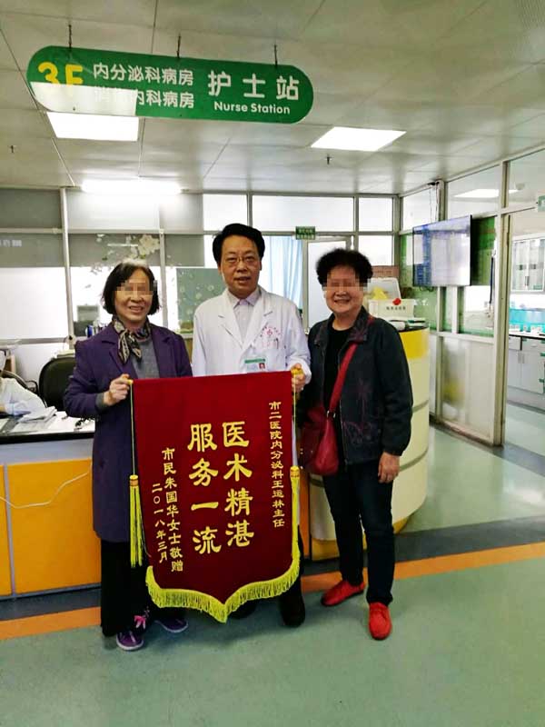 2018年初,朱阿姨因不慎跌倒致右胫骨平台粉碎性骨折,在外院手术后,创面未能完全愈合,伴有少量渗液。经介绍带着期望找到市二医院内分泌科王运林主任。王主任在详细了解、分析患者病情后,为患者制定了个性化治疗方案。针对伤口的特殊性,王运林主任和谢文卿医师为患者进行自体富血小板凝胶(APG)治疗,郭春花、李佩玲护师等为患者精心调养以及伤口管理。经APG治疗后,患者创面伤口明显缩小,迁延不愈的伤口在王主任的治疗下一步一步好转。朱阿姨和家属满心都是感恩,趁着门诊换药的日子,特意来病房为王主任送上一面代表感恩的锦旗。