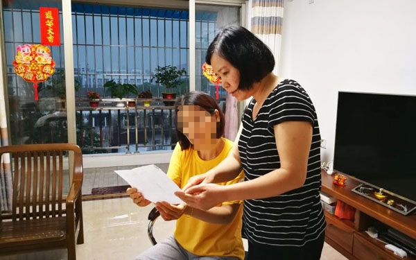 李佩玲专科护士查看琪琪佩戴的胰岛素泵,询问平日使用情况。指导胰岛素泵注射位置,检查注射部位皮肤情况。检查琪琪足部皮肤情况,指导日常足部护理知识,正确选择鞋袜等自我护理的知识和技能。