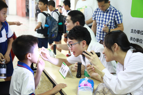 通过提问和互动,小朋友们在轻松的氛围中牢牢记住了爱牙护牙小知识。讲课结束后,口腔医学科的医生护士们为城南小学的学生们检查牙齿,深受学生及家长的欢迎。