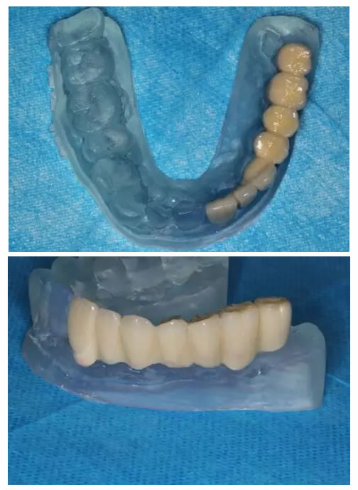 由此可见,牙冠的精密制作特别重要。针对陈先生这种情况,杜兵带领团队首先无痛性帮他拆除了旧牙套,再帮他磨除牙齿表面黑色牙质,修整牙预备体外形后,通过口内扫描数字化印模的方式,制取数字化印模,最终完成了美学和功能恢复都非常优秀的全瓷冠,为陈先生个性化打造了高精密数字化全瓷修复体。