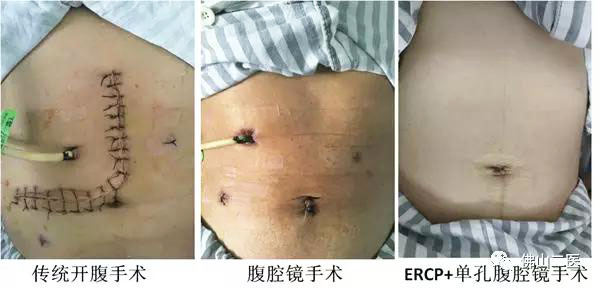 这个手术方案是佛山市第二人民医院肝胆胰外科主任温顺前带领团队率先实施的,即便在国内也属于领先。手术分为两步:先是经内镜逆行性胰胆管造影(ERCP)方法取出胆总管结石,紧接着第二天行经脐单孔腹腔镜下胆囊切除手术。术后无腹腔引流管、无尿管,手术当天就可以喝水、下床活动,次日就可以进食。