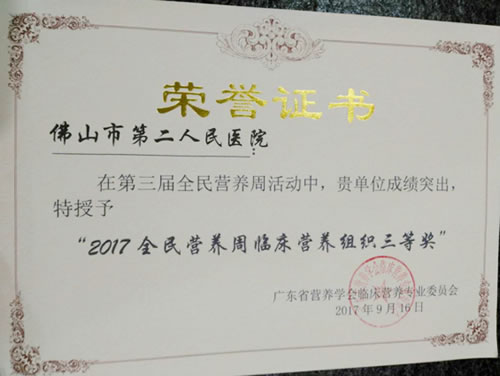 9月16日,2017年广东省营养学会临床营养专业委员会学术年会在广州召开,会上公布了2017年全民营养周的奖励名单,我院因在第三届全民营养周活动中表现突出,被授予了2017全民营养周临床营养组织三等奖的光荣称号。