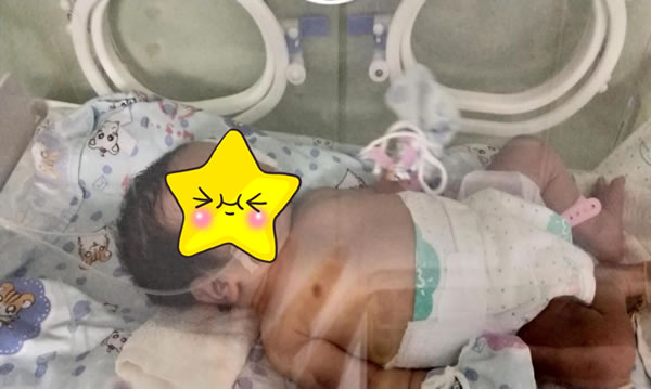 9月25日,术后第一天,产妇已经能下床活动。宝宝转儿科经治疗后情况稳定,小家伙还特有镜头感,看到拍照还睁着个小眼睛。