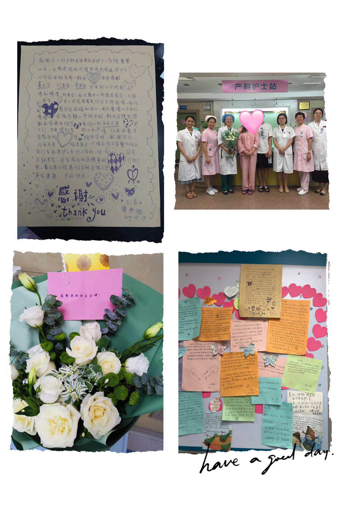 “遇到暖心的医护人员,是每一位患者的幸运!”她在信上说:“回想进院的彷徨害怕到现在终于可以回家安胎修养,期间非常感谢董主任、刘医生、贾医生,感谢她们的耐心分析病情及精湛的医术,每天最开心的就是看到一大班医生早上巡房的情景,让我感受到了温暖和安心,期间还特别感谢可爱贴心的白衣天使,护士们特别有耐心和热情,让我丝毫没有感受到住院的恐惧,谢谢你们………”字里行间流露着对妇科医护工作的极大肯定。