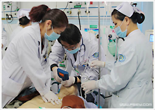 “抢救室做好准备!有一心跳呼吸骤停的患者正在转运回院,请做好抢救准备!”患者回到抢救室仍然无心跳及自主呼吸,以李晓红主任为首的抢救小组马上投入了抢救,持续心脏按压,心电监护显示心室颤动,“双向波200J,非同步,紧急除颤!直线,继续胸外按压,气管插管,呼吸机辅助呼吸!”,不到2分钟患者又出现了心室颤动,“双向波200J,非同步,紧急除颤!又是直线,继续按压!”这样的医嘱反复重复着,按压除颤没有间断过,30分钟患者还没有恢复心跳,怎么办?按照心肺复苏指南,心肺复苏30分钟患者未恢复心跳可以放弃抢救,但是李主任考虑到患者只有52岁,心跳呼吸停止时间短,而且一直在不间断地复苏,她果断决定,不能放弃,继续复苏,并且报告医务科,请求组织医院相关科室专家急会诊共同抢救,这时,心脏中心梁健球主任带领团队也赶到急诊,参与抢救,经过整整一个小时的持续胸外按压,12次电击除颤,奇迹出现了,患者恢复了心跳,有了微弱的自主呼吸。
