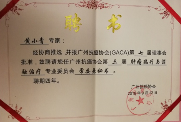 会上,经协商推选,并报广州抗癌协会第七届理事会批准,市二医院肿瘤血液科黄小青主任当选为广州抗癌协会第三届肿瘤热疗与消融治疗专业委员会常委兼秘书。同时黄小青主任当选为佛山市中西医结合学会肿瘤专业委员会第二届委员会常务委员、广东省中医药学会肿瘤专业委员会第四届委员会委员。而市二医院肿瘤血液科马庆辉医生当选为广州抗癌协会第三届肿瘤热疗与消融治疗专业委员会委员。