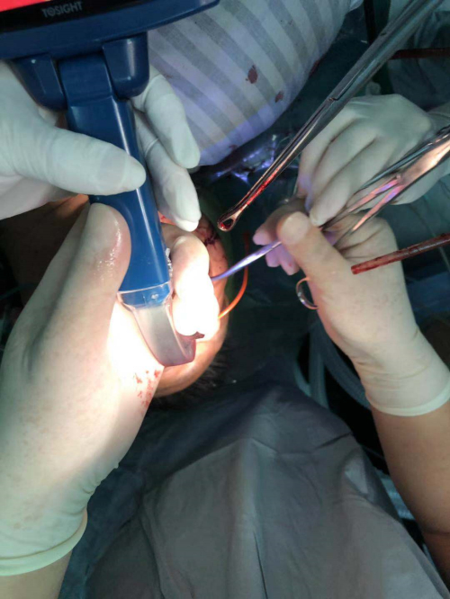 为减少出血量,耳鼻喉陈舒华主任决定先做后鼻孔填塞,耳鼻喉科医生紧急为其进行了鼻腔填塞。