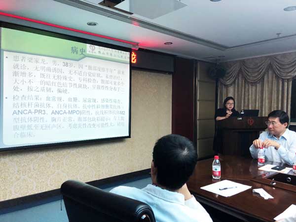 4月13日晚,为提高我院皮肤专科病理诊断水平,促进病理科与皮肤科之间的交流学习,我院病理科牵手皮肤科共同举办了“皮肤疾病病理交流沙龙”活动,此次会议特邀美国皮肤病理专家罗峰教授前来交流、授课,参加本次交流活动的还有市内其它各大医院病理科和皮肤医生。