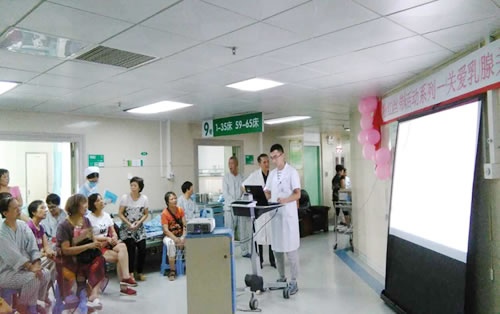 活动分为三个议程,首先由程彩萍护长讲解《乳腺癌术后患肢淋巴水肿防治》的知识,她从淋巴水肿发生的原因、淋巴水肿的危害、淋巴水肿的预防和淋巴水肿的治疗进行解说,绘声绘色,贴切生活,特别讲到自我按摩方法及患肢功能锻炼时,以身示范,演示方法规范、通俗易懂,现场气氛十分轻松和活跃,病友纷纷跟随练习,程护长还耐心地解答各位病友所提出的疑问。紧接着胸外乳腺科李鑫医师讲解《走进HER-2阳性乳腺癌》的相关知识,从HER-2阳性定义、检测方法及临床意义等方面进行讲解,并重点强调HER-2阳性乳腺癌患者的治疗进展,以手术为主要手段,辅以放化疗、靶向治疗等多种手段联合治疗,延长乳腺癌患者生存期,提高生存质量;最后指出HER-2阳性乳腺癌患者的治疗贵在坚持,鼓励病友们积极乐观面对生活,配合治疗。活动最后是超声科戴兆俊医师免费为到场的各位病友行乳腺彩超检查,强调乳腺超声是乳腺疾病筛查的重要手段,建议病友们及各成年女性定期行彩超检查,做到及早发现,及早治疗。