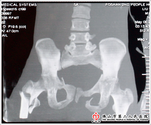 患者刘某,22岁,湖南人,因工作不慎身体被3000公斤铁板压伤15分钟左右入我院急诊科。当时患者处于休克抑制期,会阴部、右胸部的伤口虽经急诊科医生现场紧急加压包扎,但仍有活动性出血。我院立即开通绿色抢救通道,医务科组织骨科、泌尿科、肛肠科、胸外科、麻醉科等科室主任紧急会诊,紧急输血一万多毫升,并成立以骨科曹兴海主任、魏人前博士为主的救治小组,初步诊断为复合外伤:失血性休克、开放性骨盆骨折、开放性双侧髋臼骨折、右股骨粗隆间粉碎性骨折、右侧骶骨骨折、胸椎骨折、右锁骨开放性骨折,右侧骶髂关节分离、踝关节骨折脱位、肝包膜下破裂、会阴部撕裂伤,后尿道断裂、直肠破裂、马尾神经损伤。经过多科会诊后急诊入手术室行骨盆外固定支架固定及会阴部清创VSD闭式引流术+膀胱造瘘术,术后入ICU监护治疗。后期待患者病情稳定后行全身多处固定切开复位内固定及会阴部VSD多次更换缝合、肛门重建术。目前患者能在床上自由翻身活动,大便能够自行排出,全身各处骨折照片复查对位对线良好,并有骨痂生长。