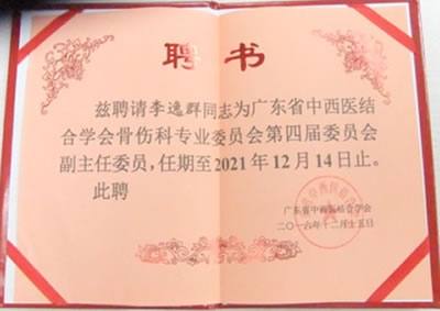 我院院长、党委书记李逸群教授当选广东省中西医结合学会骨伤科专业委员会副主任委员