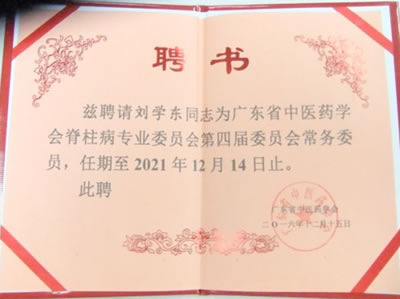 我院骨科中心负责人兼创伤关节科主任刘学东教授当选常务委员;刘学东主任同时当选广东省中医药学会脊柱病专业委员会第四届委员会常务委员