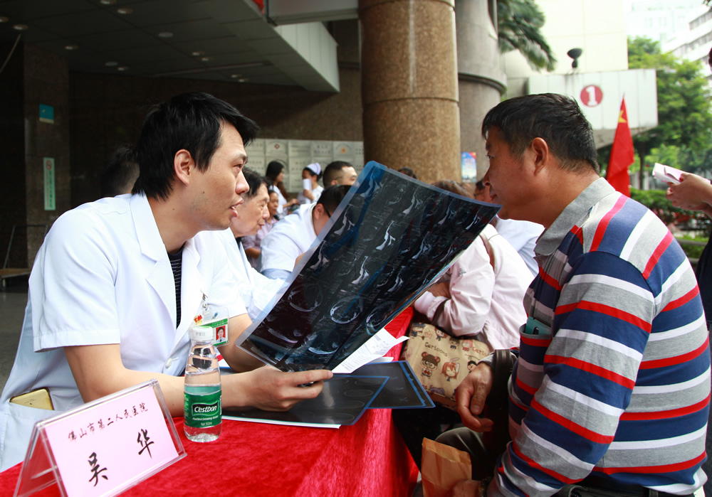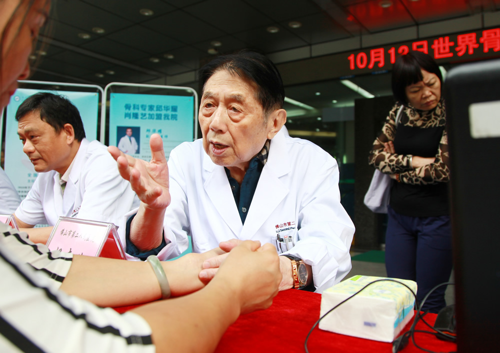10月12日是世界骨关节炎日,市二医院骨科专家们来到医院门口为市民提供骨科义诊,医院院长、党委书记、广东省名中医李逸群、骨科教授杨克非、骨科主任邱华耀、刘学东等专家为佛山市民“摸骨诊病”,义诊现场接诊了不少骨关节炎、腰椎间盘突出、骨质疏松、颈椎病、腱鞘炎等疾病的患者。