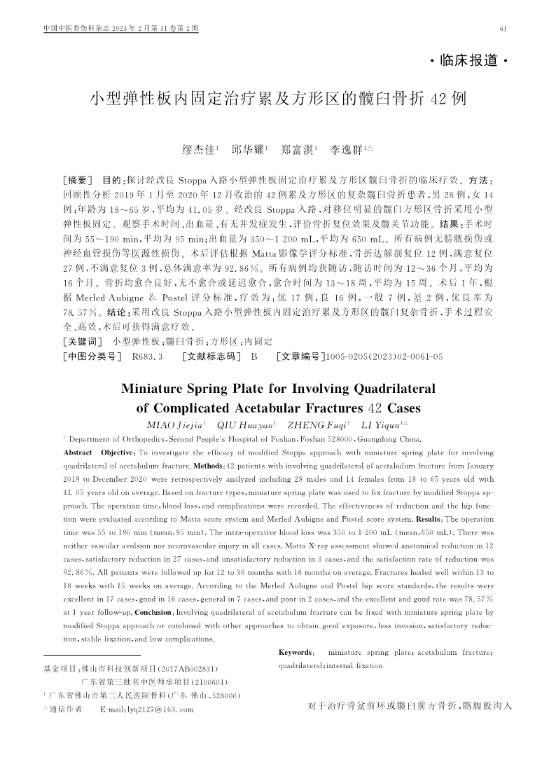 小型弹性板内固定治疗累及方形区的髋臼骨折42例