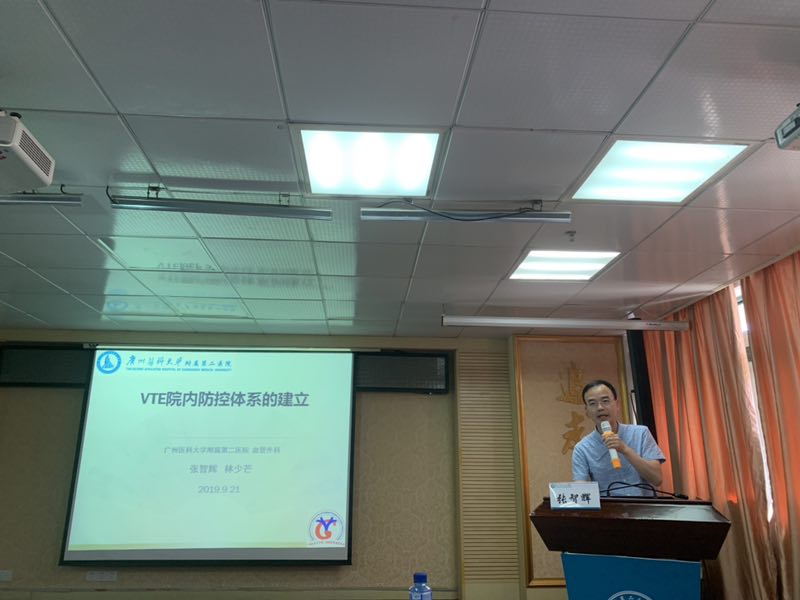 会议开始,首先由广州医科大学附属第二医院血管外科张智辉主任医师进行授课。张教授是中国医师协会血管外科分会青年委员,广东省临床医学学会血管外科专委会副主任委员、广东省基层医药学会血管外科专委会副主任委员,临床上擅长血管外科疾病的手术与腔内微创治疗,其授课题目是“院内VTE防控体系的建设”。通过其医院的体系建设经验分享,重点在于多学科协助与相互支持,做到早期筛查、早期发现,以达到VTE防控的目的,最大程度降低VTE的发生率。因VTE部分发病较急、进展较快,往往有一定的早期死亡率,所以做到早发现早治疗,才有至关重要的作用。通过张教授的授课讲解,让在座的听课人员受益匪浅。