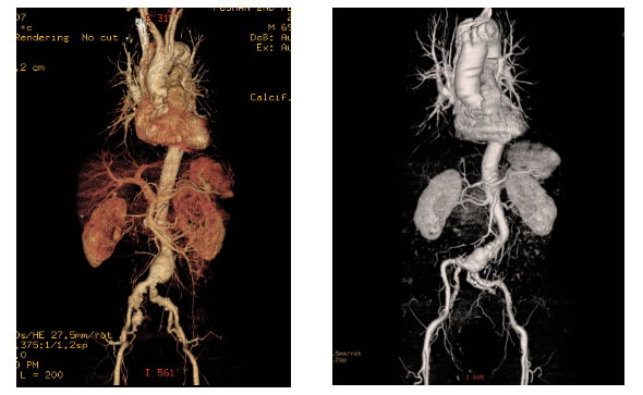 随即,两位患者转入甲状腺疝气小儿外科并完善术前的胸腹血管CT检查。黄文分析CT后,决定行介入手术—腹主动脉瘤腔内隔绝术治疗。