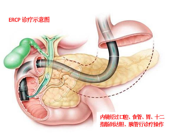 ERCP是经内镜逆行胰胆管造影术的英文缩写。十二指肠镜经口腔通过胃肠道到达胆、胰管与十二指肠的汇合口,插管进入胆、胰管并进行造影、切开、扩张、取石、置入支架等微创操作,是目前公认的诊断胆胰管疾病的金标准,也是胆胰疾病的重要微创治疗手段,为胆总管结石的首选治疗方式,尤其适合不能耐受或不愿行手术治疗的患者。