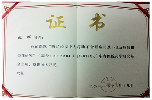 在本次大会上,姚晖博士申报的课题《药品说明书与药物不合理应用及不良反应的相关性研究》获得佛山地区唯一一项2012年广东省医院药学研究基金(奥赛康基金)资助,另外两篇论文也被大会论文集收录。这是继我院药学人员获得2011年广东省药学会医院药学科学技术奖后又一大进步,表明我院医院药学技术水平得到了省内医院药学专家的肯定和支持。