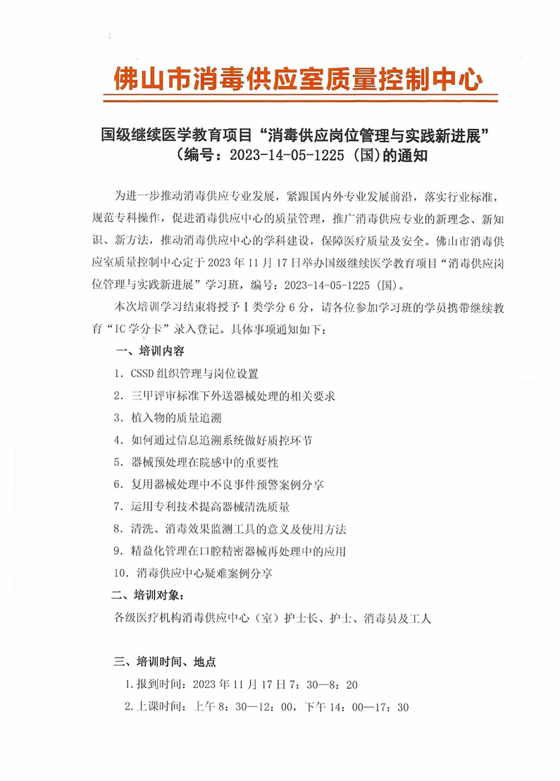 2023年佛山市消毒供应质控中心—国家级继教项目“消毒供应岗位管理与实践新进展”学习班通知