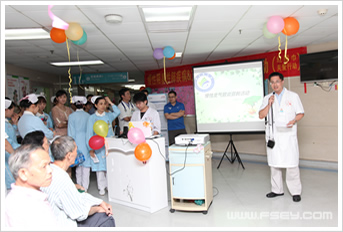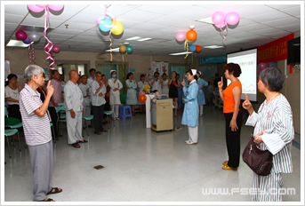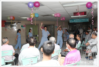 伴随着《小苹果》的音乐声,宣教活动正式开始。表演者们生动的表情、灵活的舞姿、搞笑的动作,赢得了场内患者阵阵欢笑。PPT健康宣教主要是向患者介绍慢性支气管炎的预防及饮食宣教,通过文字及图片的形式让患者清晰的了解到疾病的预防及日常生活中饮食的注意事项。互动游戏环节,9道有奖问答题,患者们争相举手,抢答不断。抢答环节后在呼吸科龚护士长的带领下大家一起进行了呼吸操的学习,呼吸操可以改善患者的肺功能,使患者得到适当的运动。老师教的仔细,患者学的认真。在一次次的医患互动中将宣教活动气氛推向了高潮,最后在一首《明天会更好》中结束活动。