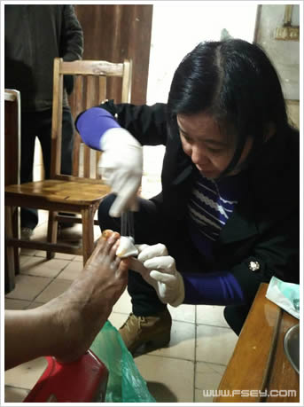 本站讯:这个冬天并不寒冷,因为爱的延续。随着团委组织的“爱在路上,志愿者上门服务活动”的开展,消化内分泌科团支部志愿者积极响应由团委开展的活动。12月29日下午,在护士长蔡春媚的带领下,志愿者们利用下班的时间到王阿姨家对其糖尿病足进行换药,并做相关健康宣教,给这个冷清的家里送去一丝热闹和温暖。