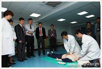 随后,院领导在技能培训中心观看了普外一区刘世强医生在腔镜模拟箱上展示的伤口缝合与打结操作,急诊科曾旭灿医生和古勋清医生带来的双人心肺复苏操作。李院长很满意,并表示要继续加大对技能培训中心的设备投入。