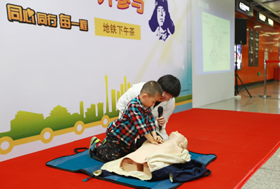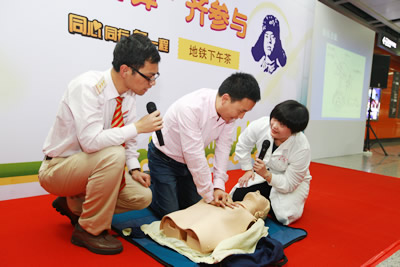 在现场,车微主治医生针对发生心跳、呼吸骤停等紧急情况,告诫乘客如何处理、并采取正确方法施救,掌握必要的操作技能,一一进行了生动讲解,同时示范操作心肺复苏安妮人模型,重点讲述心肺复苏按压位置、深度、频率等知识。市民朋友认真聆听,许多经过的地铁乘客都停下了脚步,并翻阅领取技能培训中心派发的急救小册子。随后,主持人分别邀请了两位乘客上台体验,车医师现场指导他们操作,力求通过学习,都能掌握必要的急救技能。