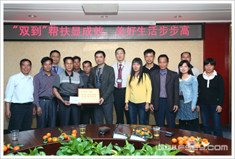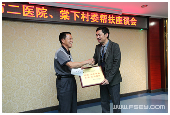 本站讯:2013年2月5日,在蛇年春节即将来临之际,我院扶贫帮扶点德庆县风村镇棠下村委会主任甘清文带领村两委全体干部给我院送来牌匾“扶贫无私奉献•大爱成效辉煌”,以此表达感恩之心。