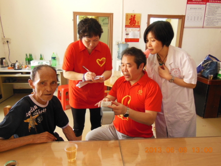 农工党党员林邵华主任医师发挥专业特长,为孤寡老人诊病。