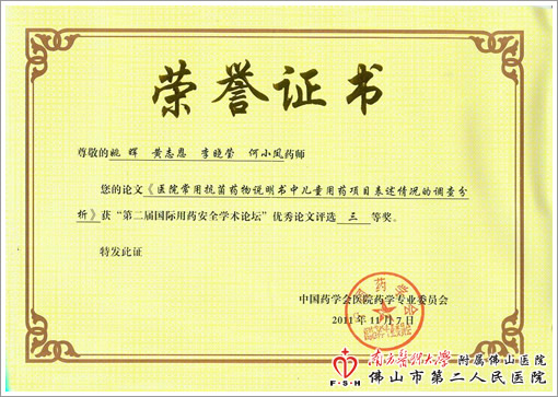 本站讯(药剂科 姚晖供稿):由中国药学会医院药学专业委员会主办、北京大学第三医院承办的第二届“国际用药安全学术论坛”于11月6—8日在杭州召开,会议主题是“药师应在用药安全领域发挥主导作用”。会议邀请了美国、英国、加拿大、香港、台湾等国家和地区的国际知名专家报告用药安全领域的最新研究成果,探讨如何在医疗机构中构建用药安全的持续监测、评价和改进体系,特别是如何发挥药师的主导作用。由我院药剂科姚晖、黄志恩、李晓莹、何小凤等药师完成的论文《医院常用抗菌药物说明书中儿童用药项目表述情况的调查分析》获得论文三等奖荣誉。