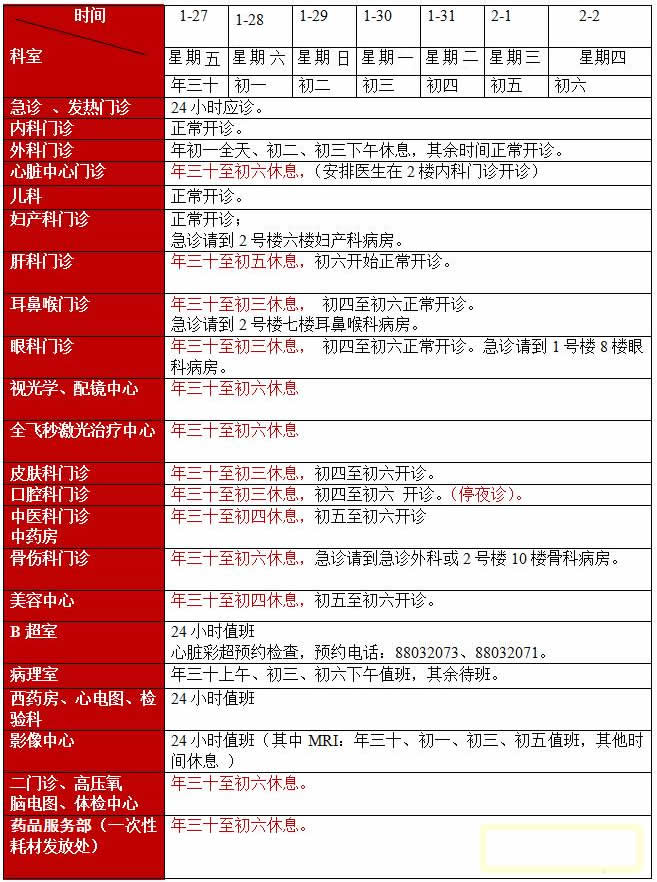 2017年春节放假通知 发布时间:2017-01-26 点击数: 次 按照国家有关规定,结合医院实际情况,经医院领导班子研究决定,2017年春节放假安排如下: 一、放假时间 2017年春节放假调休七天(1月27日—2月2日)。 1月27日(星期五,农历除夕)、1月28日(星期六,农历正月初一)、1月29日(星期日,农历正月初二)为法定节假日; 1月22日(星期日)、2月4日(星期六)照常上班。 二、具体各科节假日安排如下: 佛山市第二人民医院 分享到: 返回列表 推荐新闻 查看更多